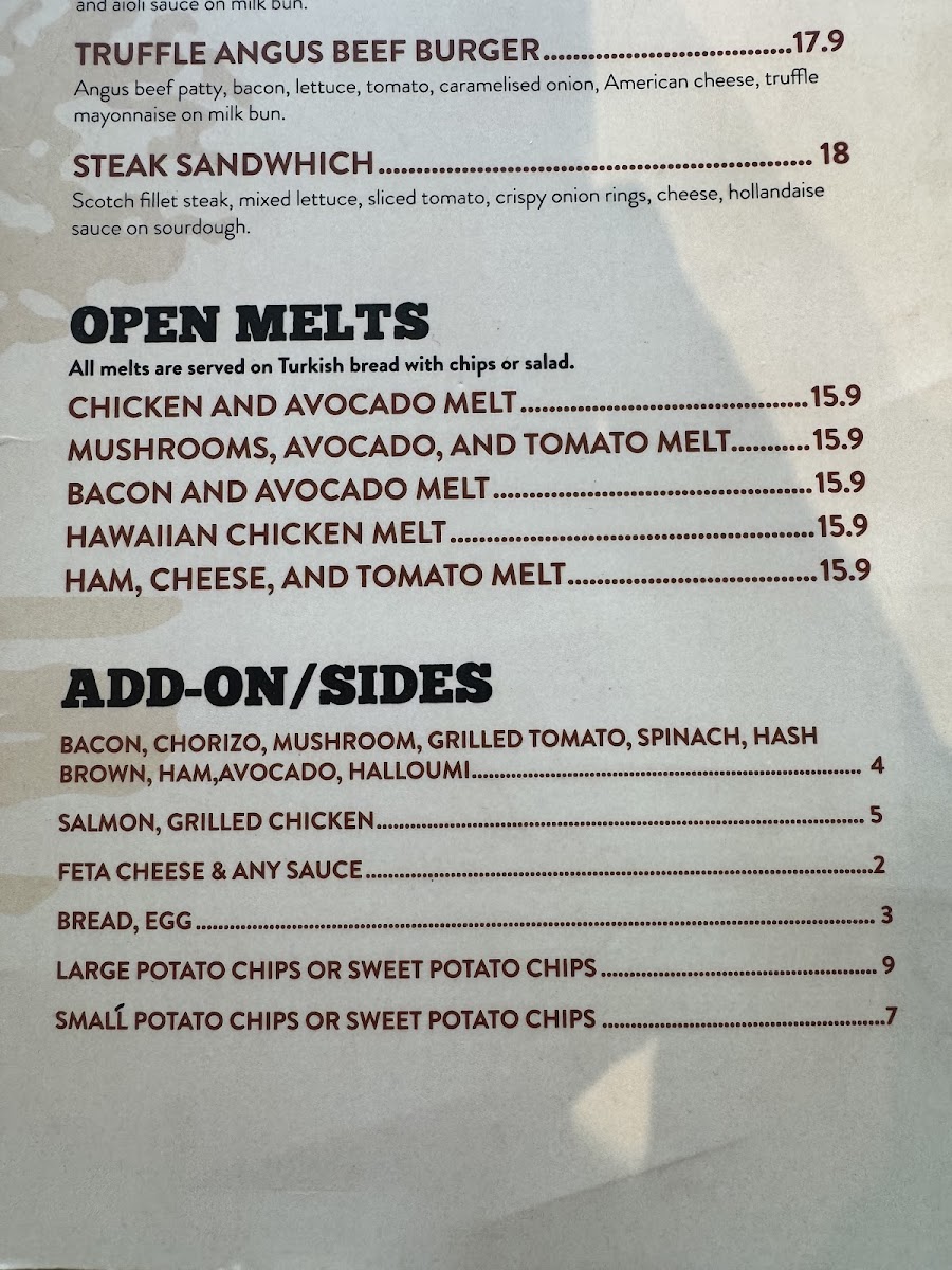 - Hearty Add-Ons: Customize your meal with tempting sides such as bacon, chorizo, and avocado, all for just A$4.00.